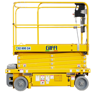 The short 8m electric scissor lift for rental from Giffi Noleggi allows you to work in absolute safety thanks to the automatic anti-tilt device.
