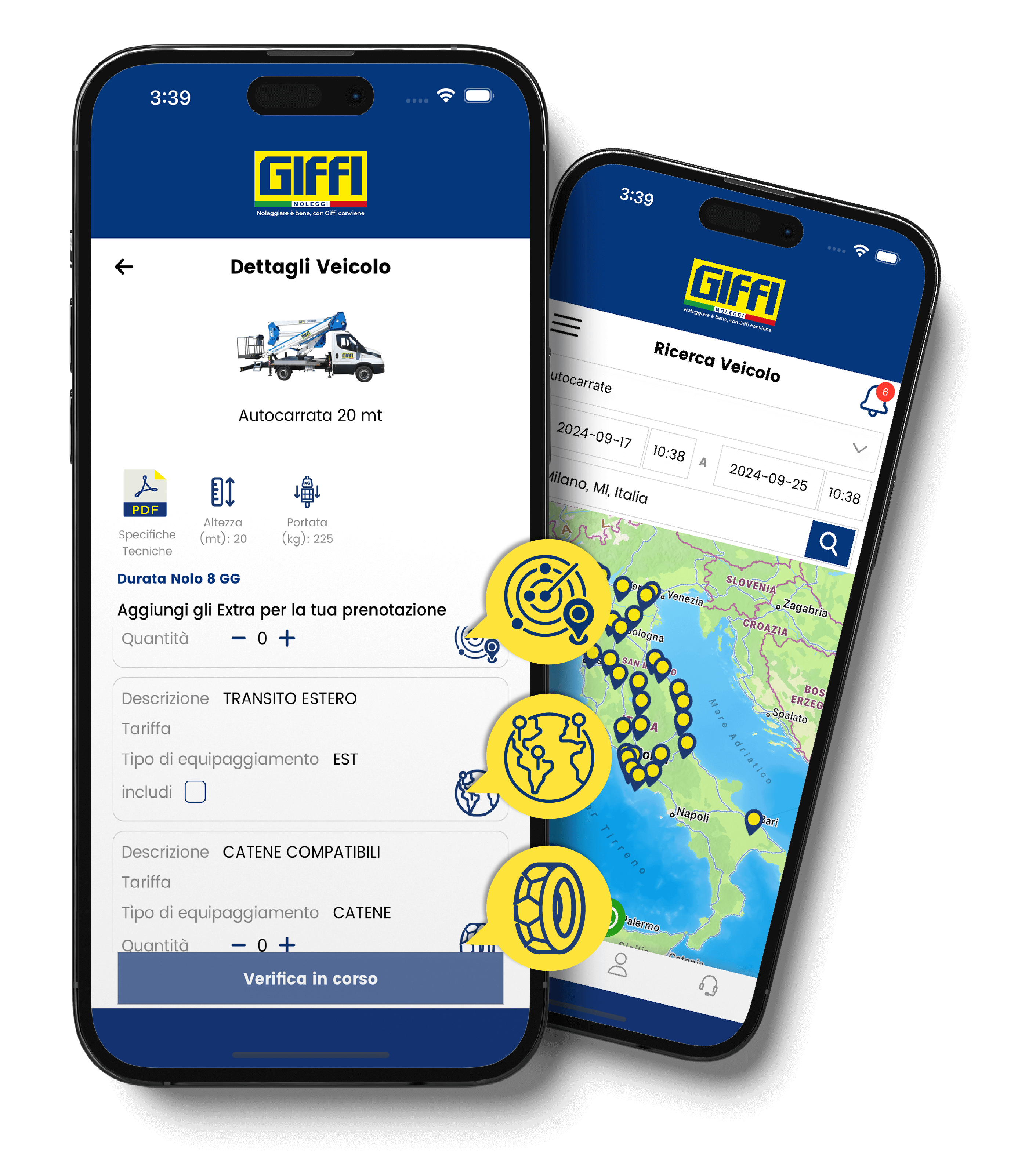 Non importa dove ti trovi, in città, in cantiere o in mezzo alla natura, con Giffi App, il mezzo giusto è sempre vicino a te. La nostra rete copre tutto il territorio Nazionale con 45 sedi operative e oltre 2000 mezzi, offrendoti soluzioni ovunque tu sia.
